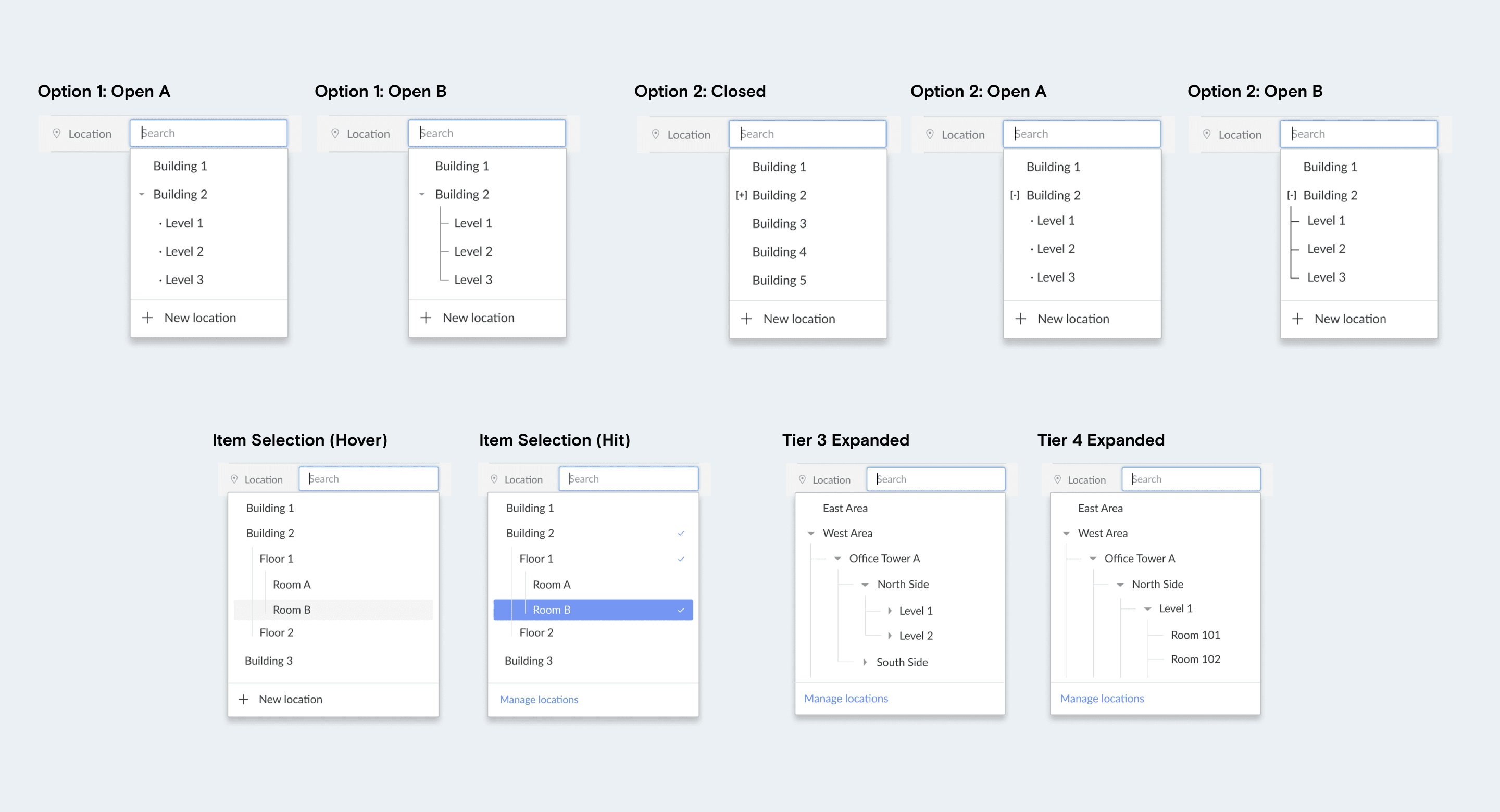 I explored multiple options to represent the dropdown UI. Some of those options are presented in the above image. After testing with users, we chose to go with expanding and collapsing the location levels to see further levels under them.
