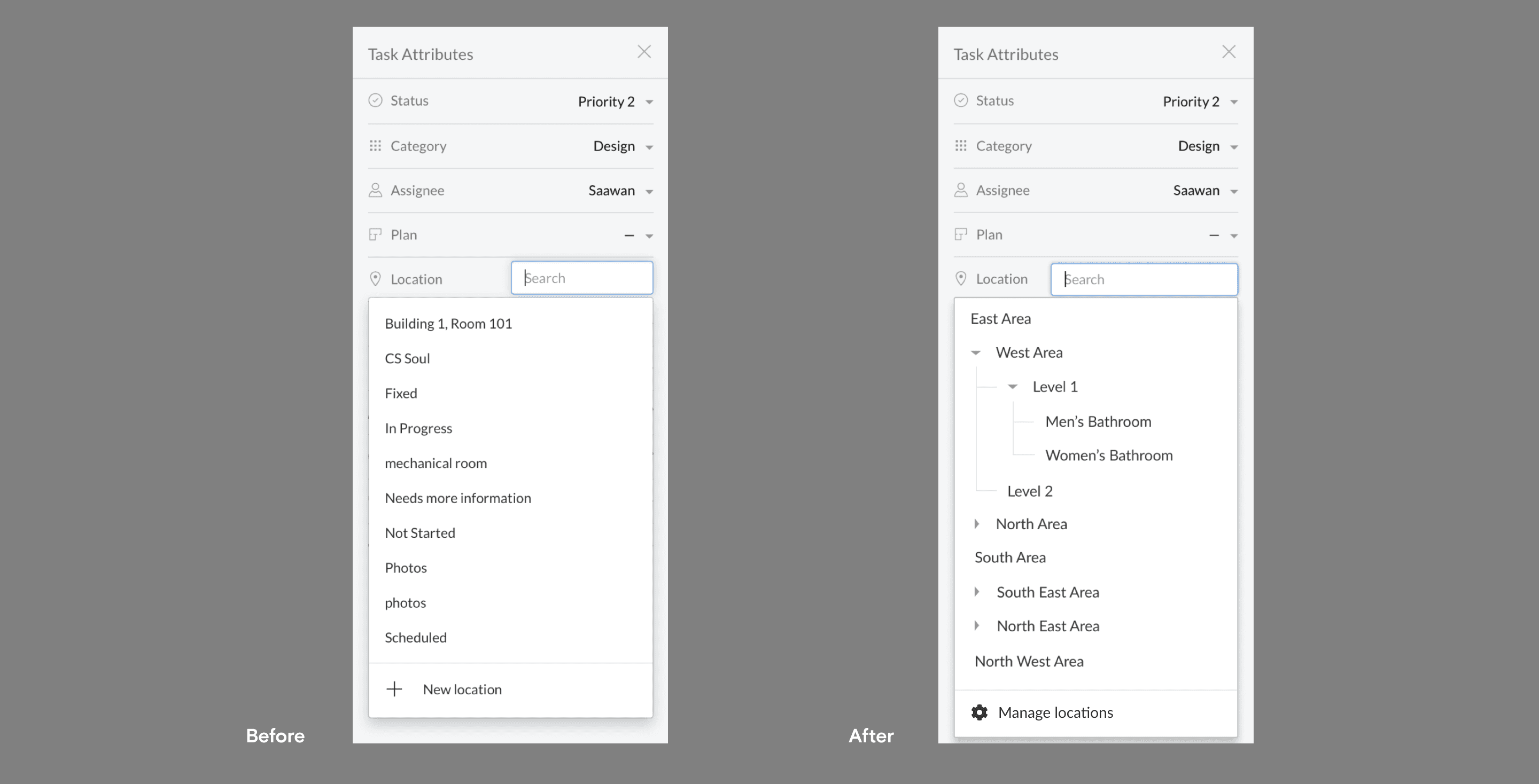 Before the location nesting feature was released, Fieldwire users were able to select and tag only one defined location to a task. It was hard for construction companies to define a location within a big project where the location can be under several levels. They wanted to define a temporary address to send the workers to the exact location.