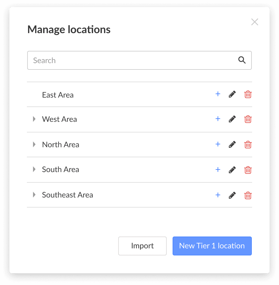 The user can create a new tier 1 location or import locations using the buttons at the bottom. He can create further tiered locations by clicking the ‘+’ icon agains each location.