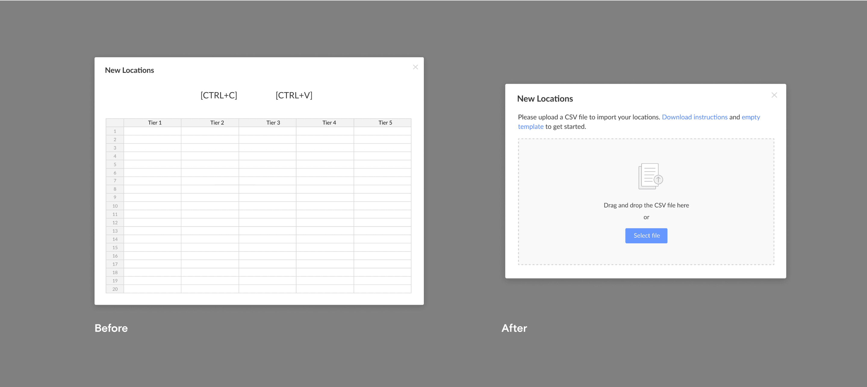 out that they find it easier to upload the CSV file as the changes were made in Excel locally and saved to the file. So, I came up with a new UI where the user can drag and drop their CSV file that was edited in Excel and upload their locations.